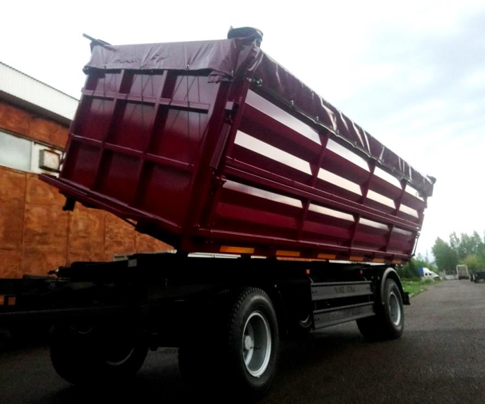 Три опорные балки с двумя гидроцилиндрами. Цвет платформы по выбору. Исполнение задней части: исполнение задней части может быть исполнена по выбору заказчика , возможность установки распашных ворот, люка под зерномёт, с открывающимися бортами с верхней навеской в нижней части ворот. Пол стальной 4мм, Борта 3мм.